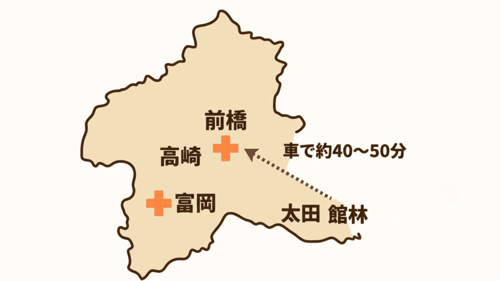 特に館林・太田エリアにお住まいの方は、夜間救急の病院(前橋・富岡)まで車で40〜50分かかることを頭に入れておいてください。